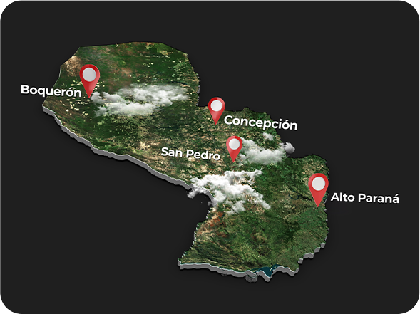 Operamos en 11 estancias ubicadas estratégicamente en los departamentos de Alto Paraná, San Pedro, Concepción y Boquerón.